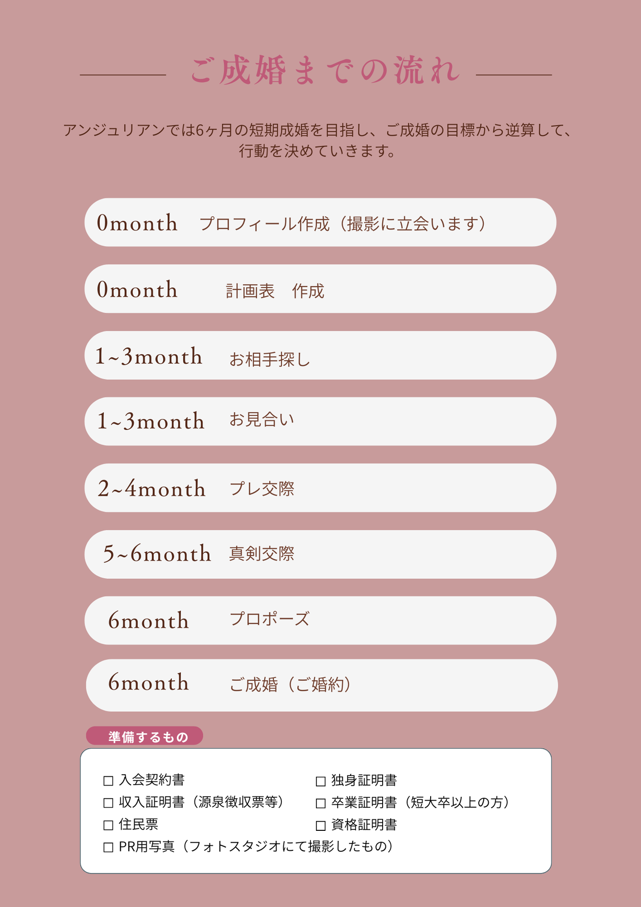 だいたい3か月を目途に結婚を前提とした真剣交際に入っていただき、その後プロポーズ→ご成婚となります。